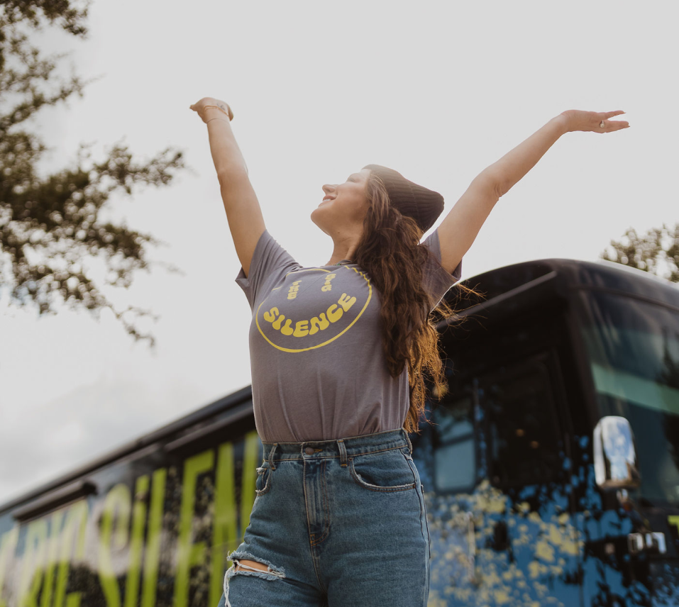 Karena loves fashion and created a stylish line to help share the message of The Big Silence. The clothing and accessories offer a point to start conversations when you wear it. The line helps to promote awareness of our mission and increase engagement for our social good campaigns.