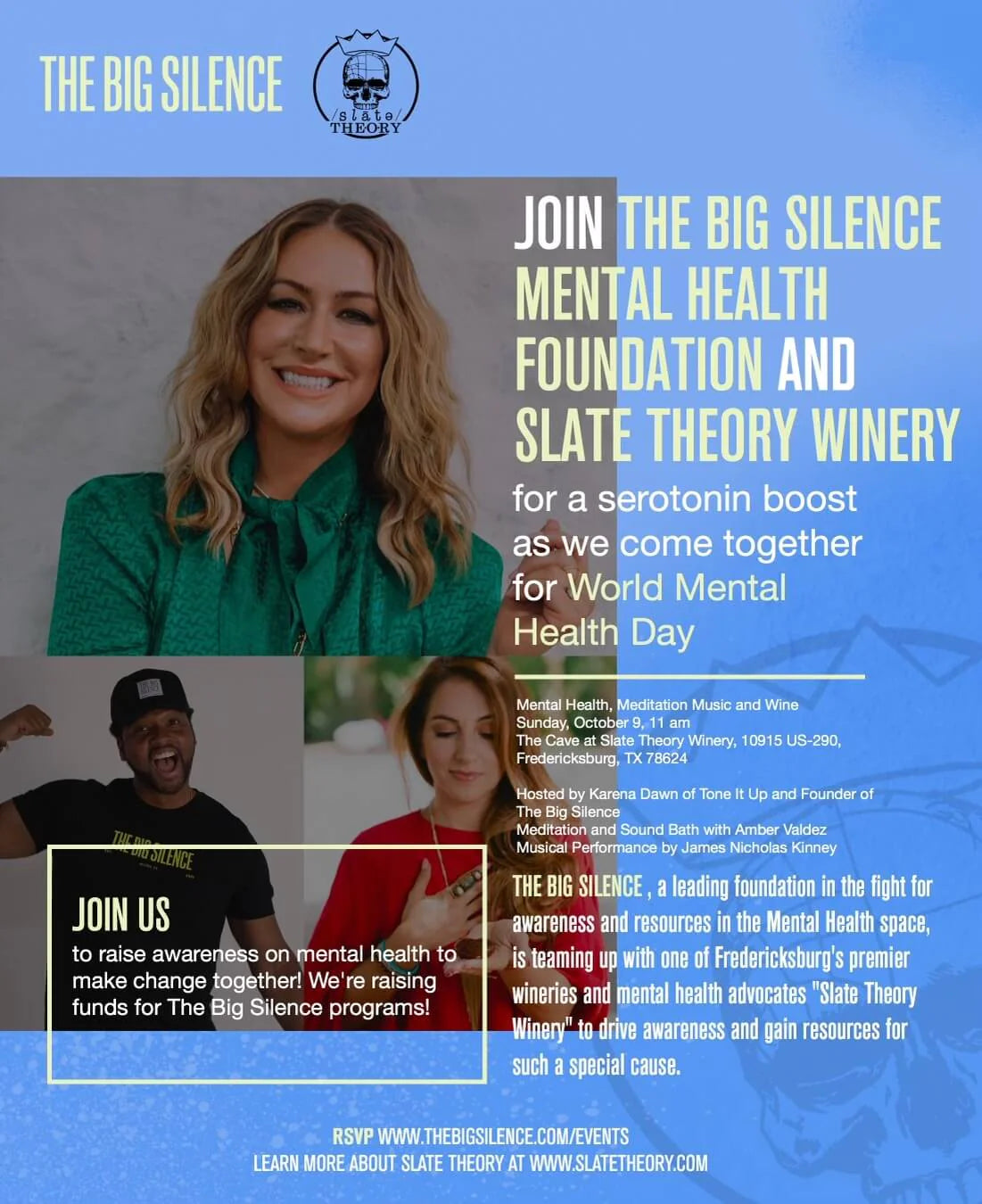 The Big Silence, a leading foundation in the fight for awareness and resources in the Mental Health space, is teaming up with one of Fredericksburg's premier wineries and mental health advocates Slate Theory Winery to drive awareness and gain resources for such a special cause.
