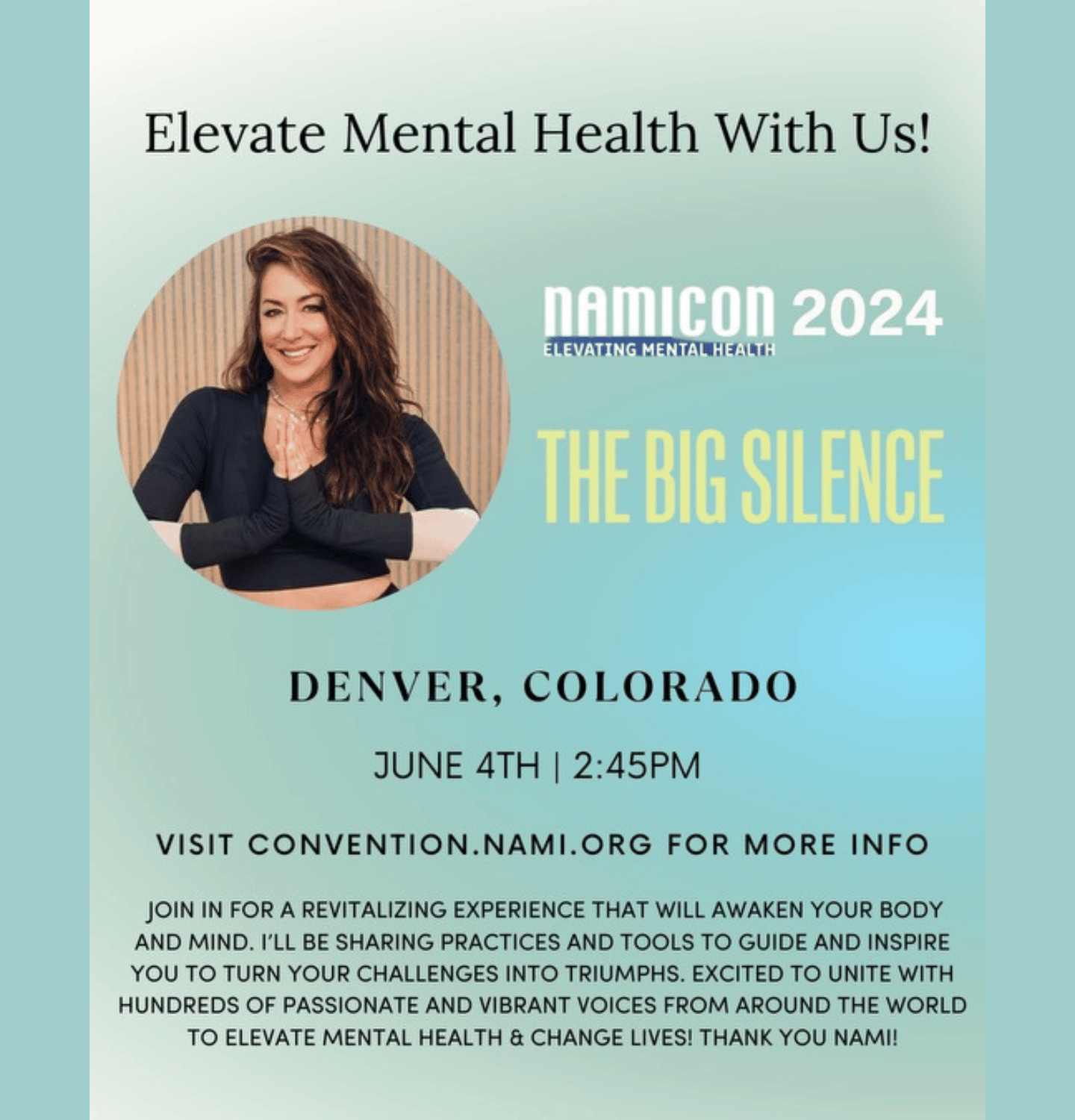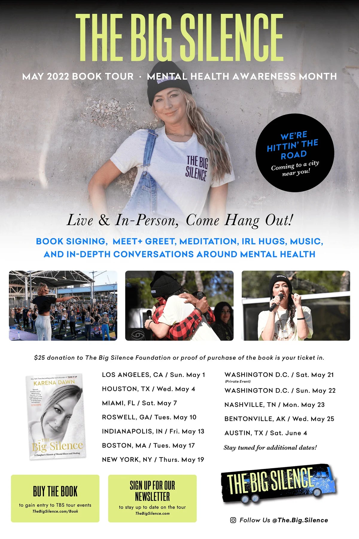 Karena Dawn and The Big Silence hit the road for National Mental Health Awareness month with weekly events featuring movement, meditation, music, mental health panels and conversations, and book signings.