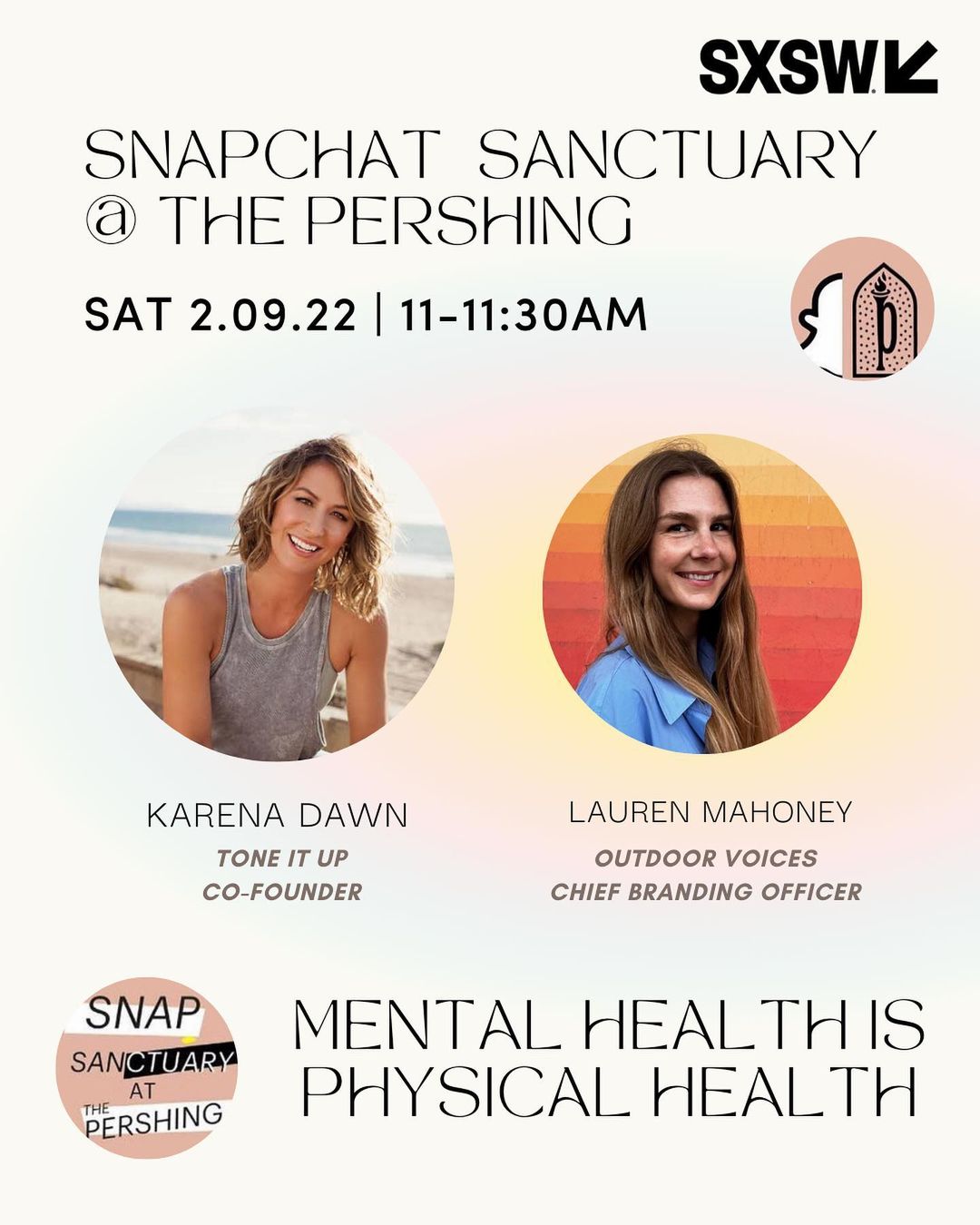 Catch Karena speaking on Saturday 11am for a mental & physical health chat at the Snap Sanctuary at Pershing with Tone It Up and Outdoor Voices.
