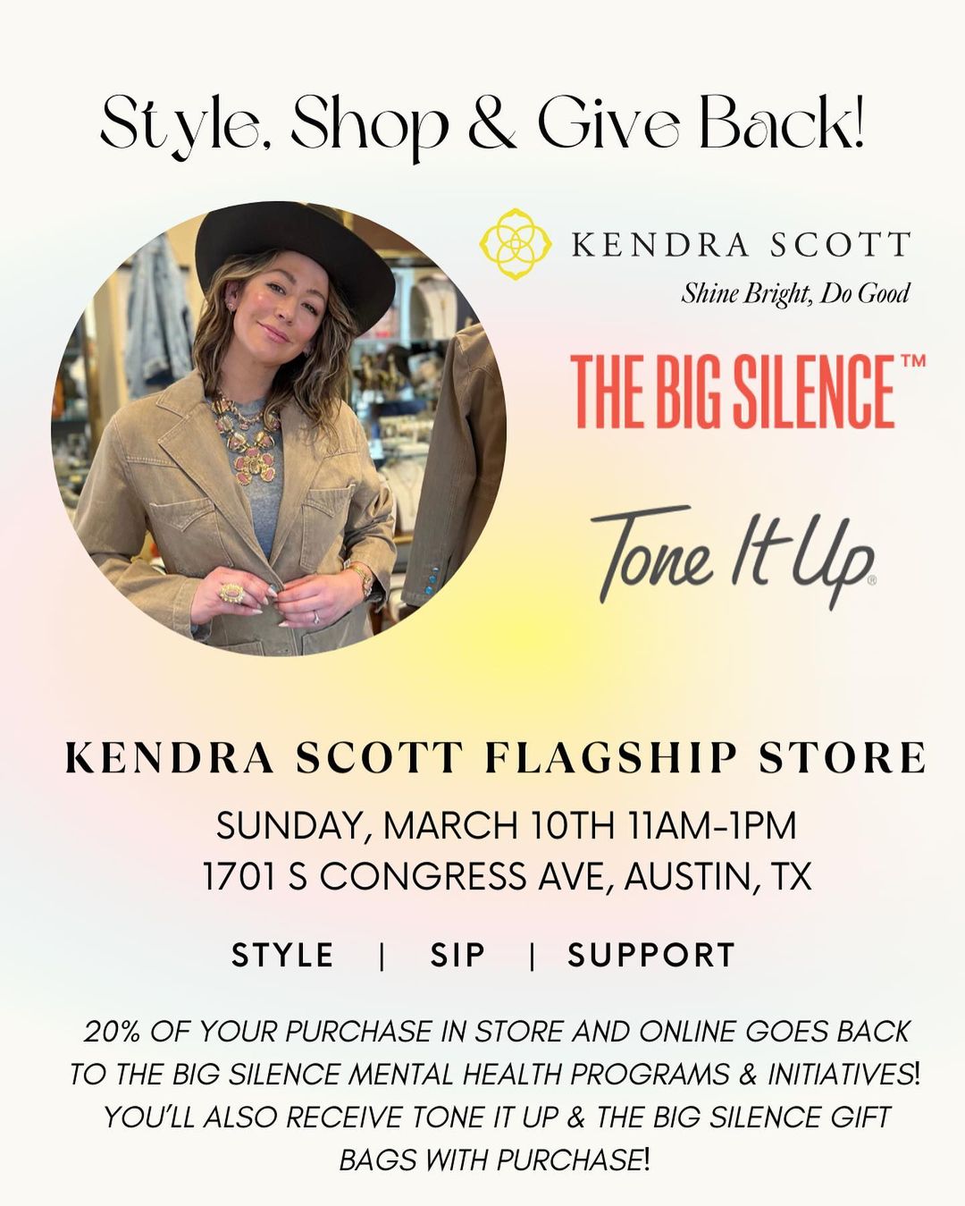 20% of Kendra Scott sales given back to The Big Silence Foundation for mental health.