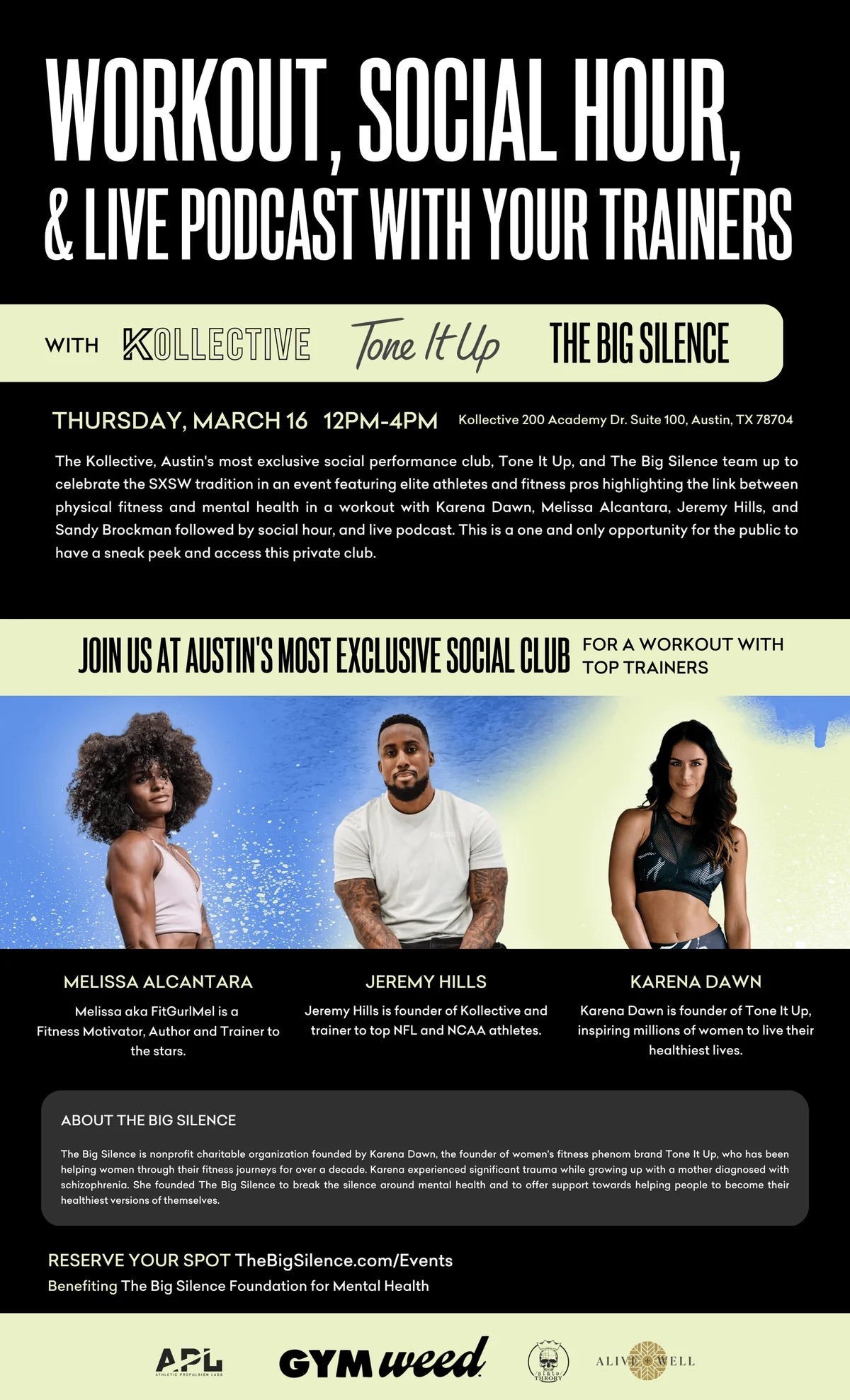 The Kollective, Austin's most exclusive social performance club, Tone It Up, Gym Weed, and The Big Silence mental health foundation team up to celebrate the SXSW tradition in an event featuring elite athletes and fitness pros highlighting the link between physical fitness and mental health followed by social hour, and live podcast. This is a one and only opportunity for the public to have a sneak peek and access this private club. Ticket sales benefit The Big Silence Foundation youth programs for mental health. Reservations required.