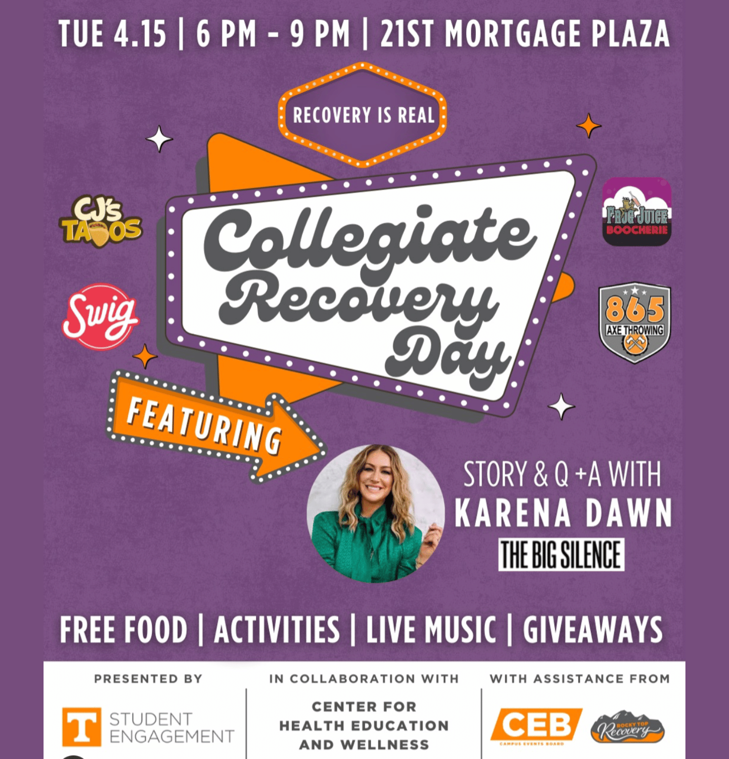 Join the Center for Student Engagement, in collaboration with the Center for Health Education and Wellness, with assistance from the Campus Events Board and Rocky Top Recovery for Collegiate Recovery Day 2025! This year, we are excited to welcome special guest Karena Dawn from the Big Silence! Hear her inspiring story of resilience, mental wellness, and recovery while connecting with a supportive community. The event will also feature free food, activities, giveaways, including a FitBit and Hatch Alarm Clock, and resources from community & campus partners, while supplies last! Don’t miss out on this empowering event!